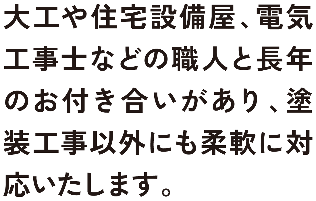 大工や住宅設備や、電気工事士などの職人と長年のお付き合いがあり、塗装工事以外にも柔軟に対応いたします。
